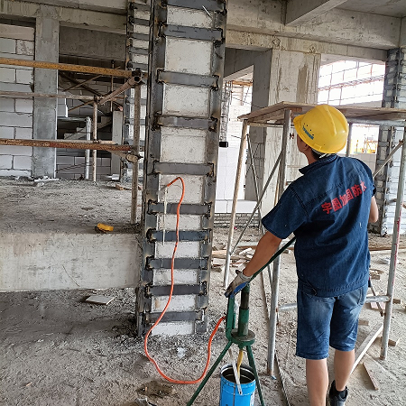 包钢加固工艺是将钢板和角钢外包于混凝土构件的表面,砼钢之间以包钢灌注胶填充,利用钢板良好的抗拉、压性能及胶液优异的粘结强度,使钢板与原混凝土构件能协同工作(钢板实际上起到与构件受拉压钢筋同样的作用),达到增强构件承载力及刚度的目的。
