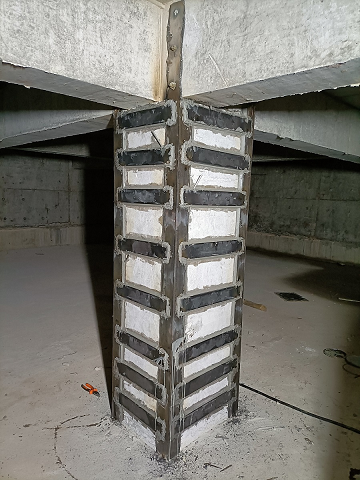 (一)外包钢加固法:外包钢加固是把型钢或钢板等材料包在被加固构件或杆件的外侧,通过外包钢与原有构件的共同作用,提高构件的承载力、增大延性和刚度的一种加固法。主要适用于建筑物空间使用上不允许增大构件截面尺寸,却又要大幅提高其承载力的构件加固,如混凝土梁、柱、屋架以及砖窗间墙、砖柱等构件或构筑物的加固。